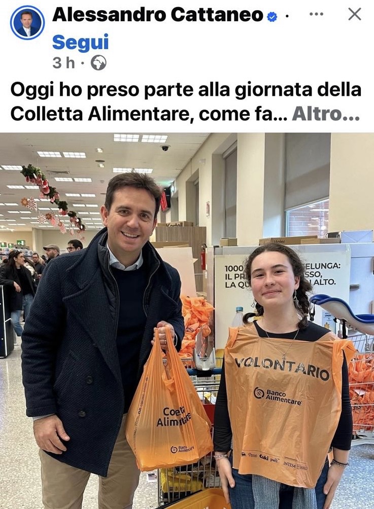 Bella iniziativa del nostro, che esibisce un sacchettino vuoto a tre quarti per la colletta alimentare.