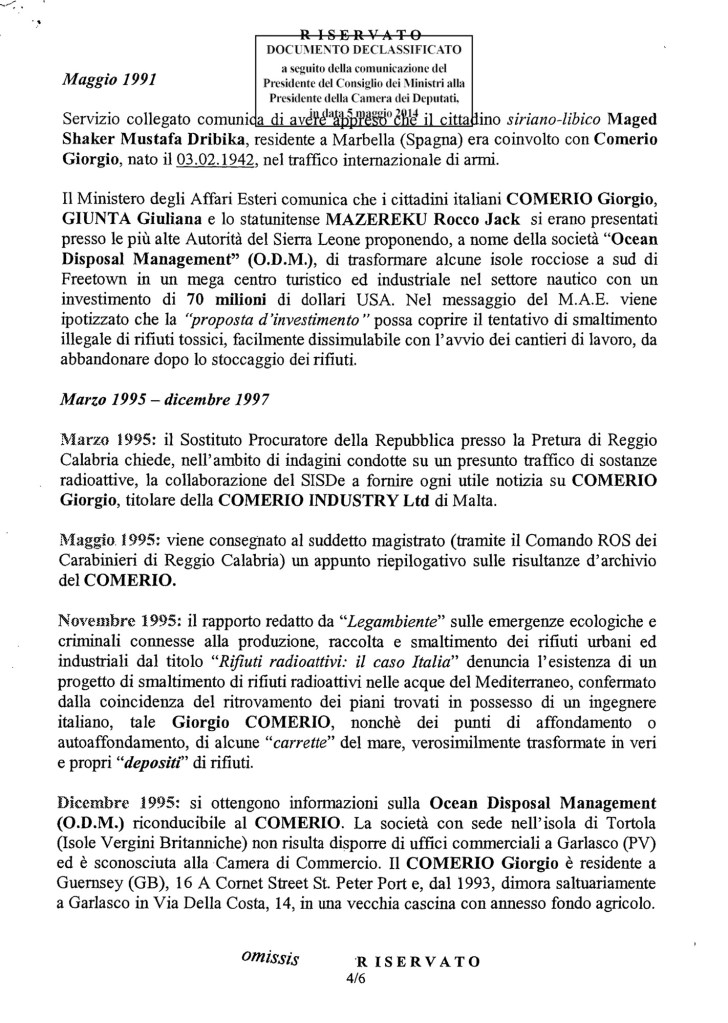 Altri spifferi dicono che venne trovata una cartellina gialla col numero 31, con all’interno i certificati di morte di Ilaria Alpi e Milan Hrovatin, uccisi in Somalia, stilati sulla nave Garibaldi in rada a Mogadiscio.