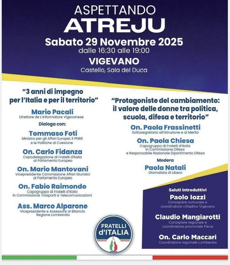 Al Castello di Vigevano domani andrà in scena “Aspettando Atreju”, che ormai è l’evento politico più atteso dopo l’arrivo della fibra nelle campagne. Sul palco si alterneranno relatori così convinti che per un attimo qualcuno ha creduto davvero che il PNRR esistesse, non i suoi fondi eh.