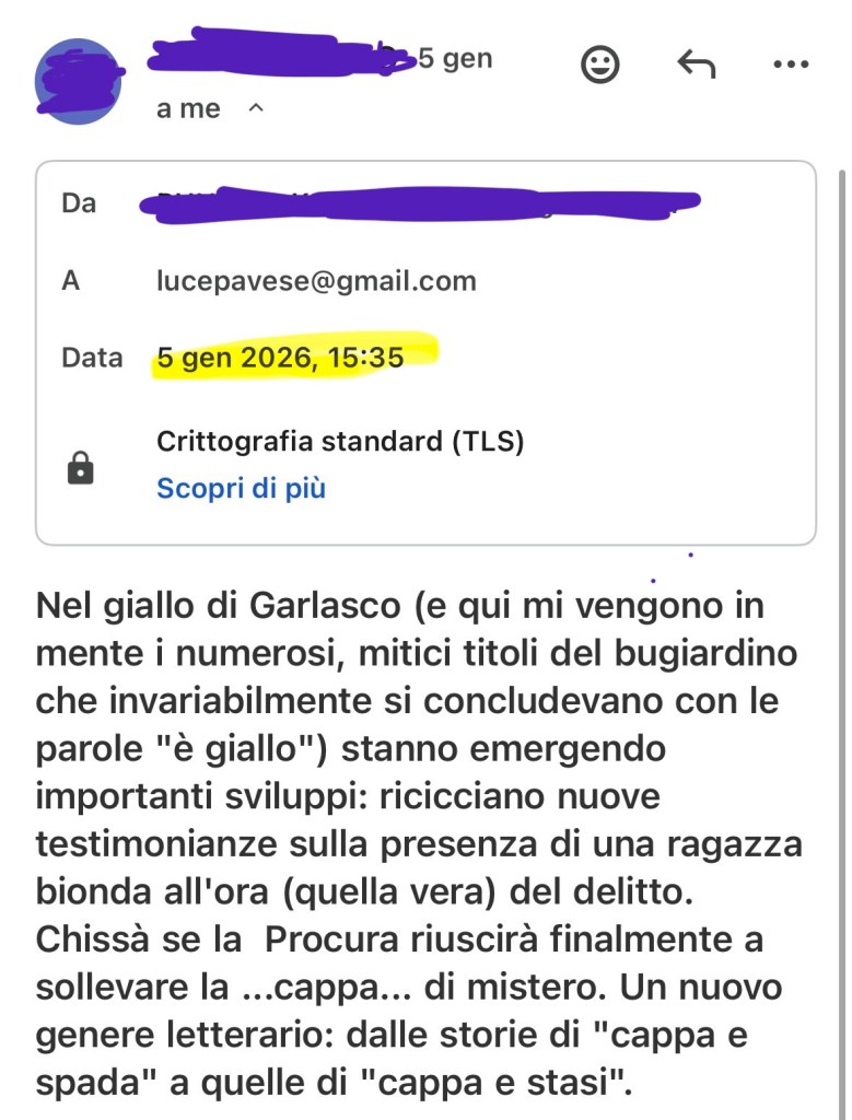In sintesi e schematica, è questa roba qui sotto, con l’aggiunta di una testimonianza relativa alla presenza della madre, in auto la famosa mattina.