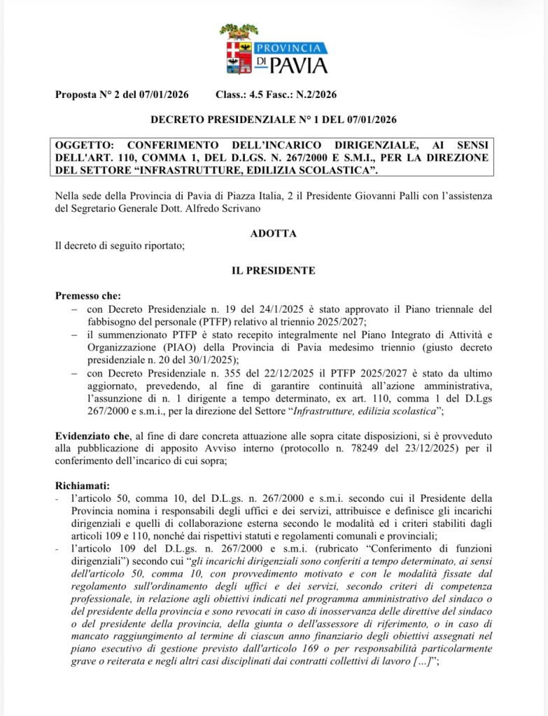 • Rilievo: Il decreto non esplicita le ragioni per cui le competenze necessarie non potessero essere rinvenute tra il personale dirigenziale già in ruolo. L’assenza di tale motivazione espone l’amministrazione al rischio di contestazioni per danno erariale, stante il maggior onere finanziario che un incarico a contratto comporta rispetto all’utilizzo di risorse umane già organicamente presenti.