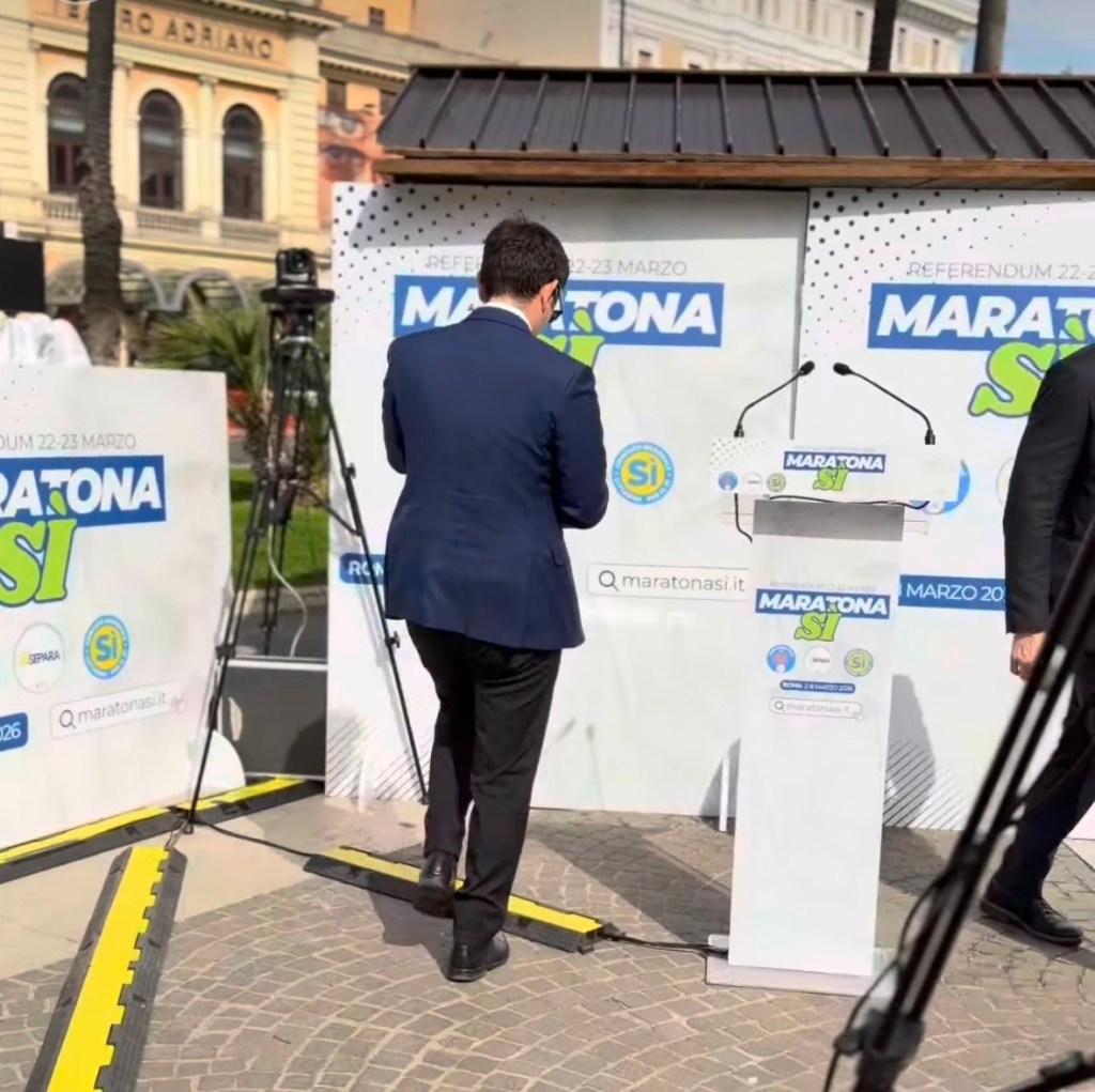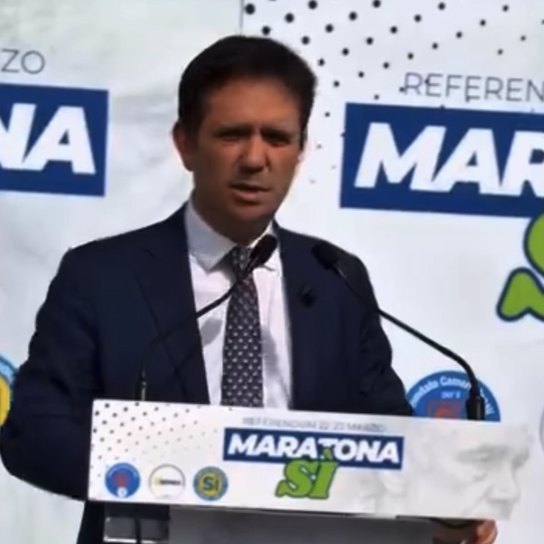Il maratoneta per il referendum sulla giustizia, Dorando Pietri, fa un comizio da solo in una piazza con scenografia di cartone.