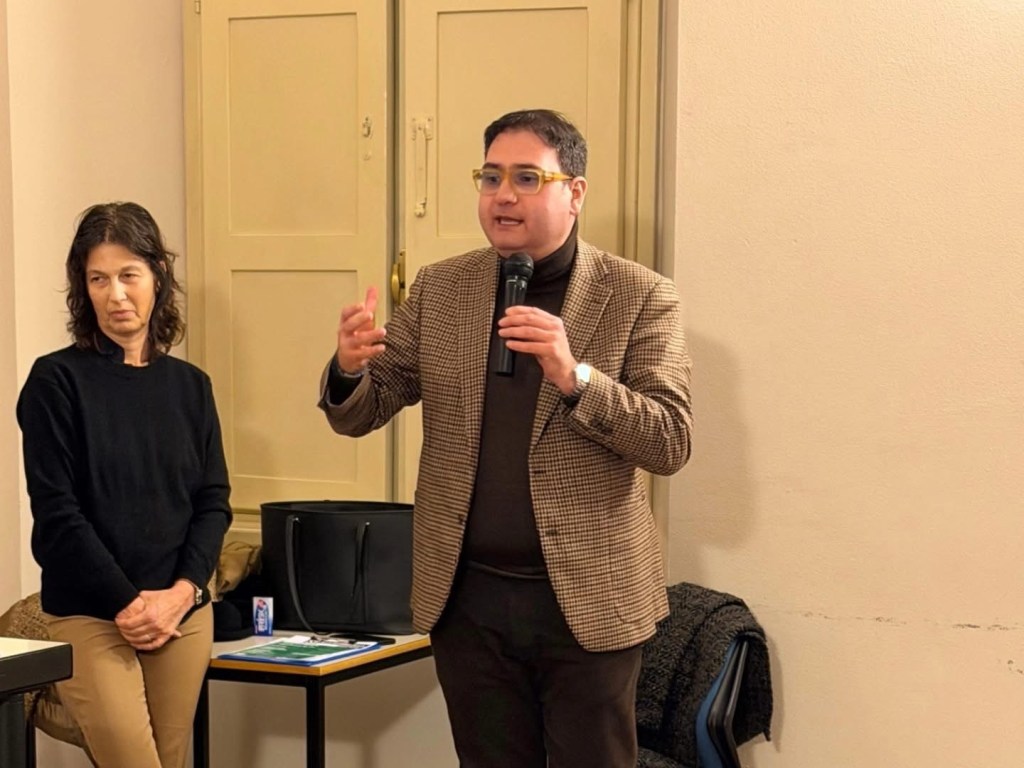 Cicciocane presenzia alla serata scarsamente partecipata dell’altra sera sul referendum a Mortara col completo marrone.