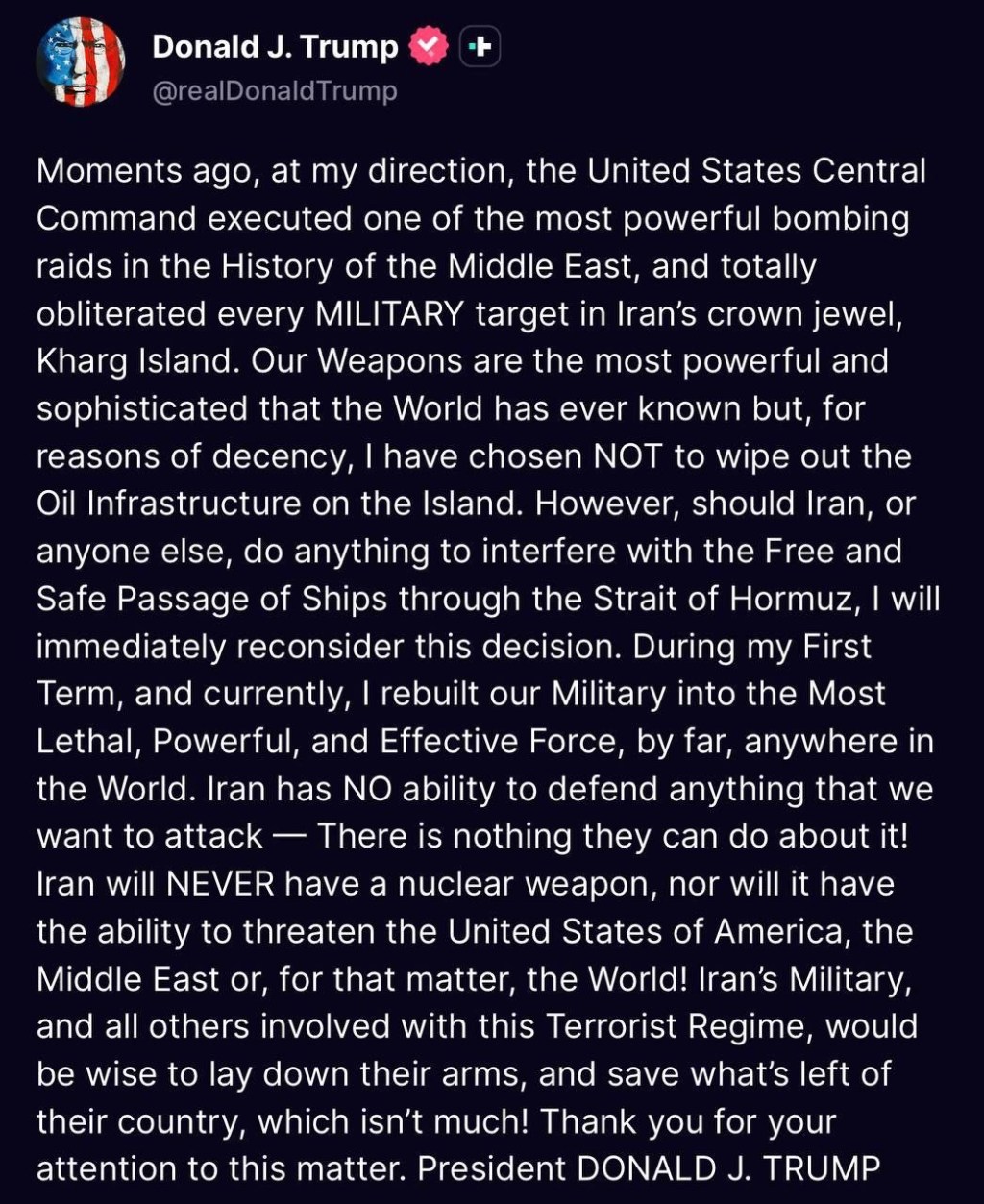 Pochi istanti fa, durante la mia amministrazione, il Comando Centrale degli Stati Uniti ha effettuato una delle più potenti incursioni aeree nella storia del Medio Oriente, distruggendo completamente ogni obiettivo militare sull’isola di Kharg, il gioiello della corona dell’Iran. Le nostre armi sono le più potenti e sofisticate che il mondo abbia mai conosciuto, ma per ragioni di equità, ho scelto di non cancellare l’infrastruttura petrolifera sull’isola.