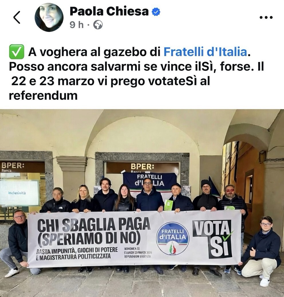 Paola porta lo striscione in giro per la provincia. Qui a Voghera, poi in altri paeselli. Foto, striscione e via.
