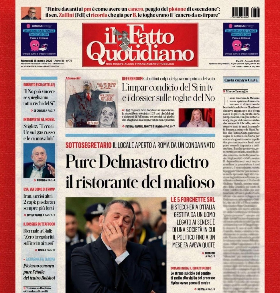 L’ultimo scontro tra maggioranza e opposizione, alla vigilia del referendum, vede come attore protagonista il sottosegretario alla Giustizia Andrea Del Mastro Delle Vedove. La miccia è un articolo pubblicato sulle pagine del Fatto Quotidiano sulla società «Le 5 Forchette srl», destinato a gestire un locale alla periferia di Roma e fondata, tra gli altri, dallo stesso Delmastro, oltre che da esponenti di Fratelli d’Italia del biellese, e da Miriam Caroccia, studentessa romana appena diciottenne e figlia di Mauro, legato a doppio filo ai clan e attualmente in carcere a Viterbo, dove sconta una condanna definitiva a 4 anni per intestazione fittizia di beni aggravata dalla mafia, in quanto considerato prestanome del boss di camorra Michele Senese. Una vicenda che ha scatenato l’ira delle opposizioni, pronte a chiedere le dimissioni del sottosegretario.