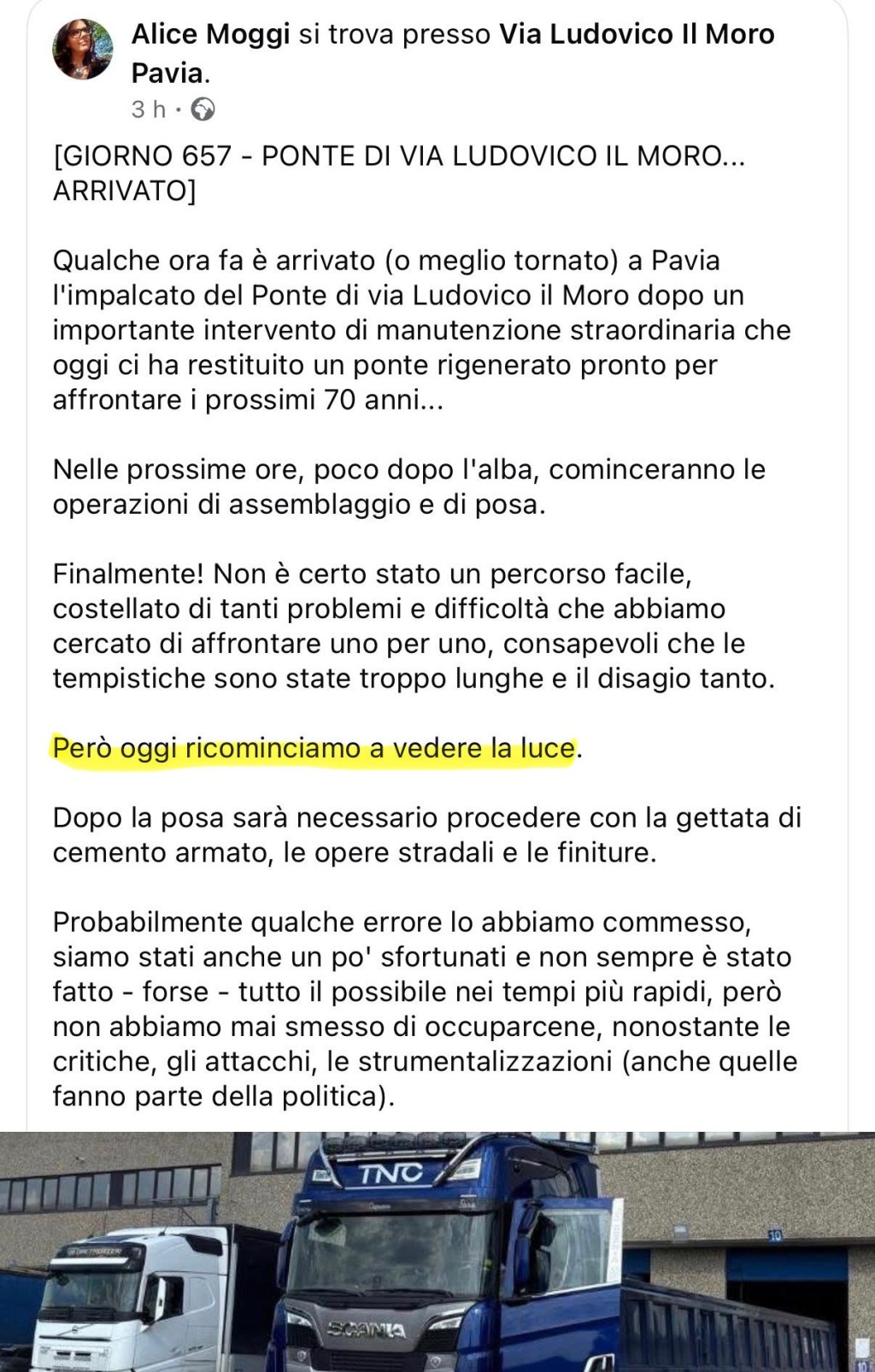 Bruciata sul tempo, dichiara che il ponte è a Pavia, ma non si vede ancora.
